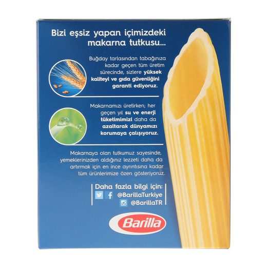 Barilla değirmenlerinde özel yöntemlerle üretilen Barilla her zaman " al dente " kıvamı ve mükemmel lezzeti garanti eder.Daima mükemmel pişer ve harika tadının keyfini hafif bir makarna sosu ile arttırabilirsiniz.