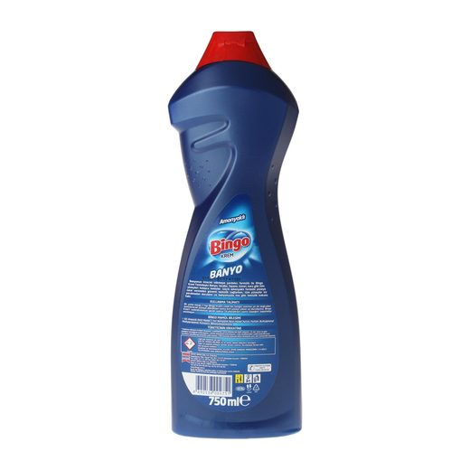 Bingo Krem Banyo, amonyaklı kireç çözmeye yardımcı formülü ile banyodaki sabun ve kireç artıklarına karşı etkilidir. Kolay durulanır, ovalamadan temizlik sağlar.