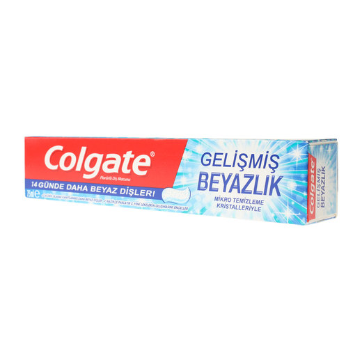 Colgate gelişmiş beyazlık klinik olarak kanıtlanmış aktif mikro kristaller içeren formülü ile dişlerinizi nazikçe temizler yeni lekelerinin oluşmasını engellemeye ve 14 günde daha beyaz dişlere kavuşmanıza yardımcı olur.