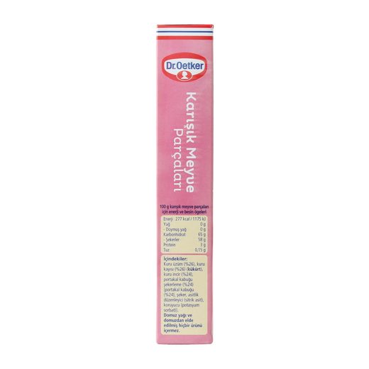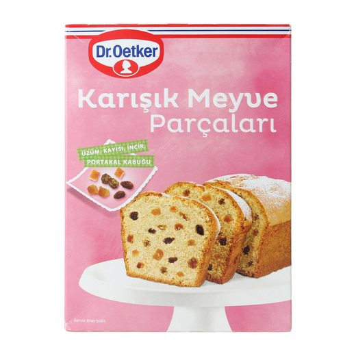 Tariflerinizi Karışık Meyve Parçaları ile daha da etkileyici ve lezzetli kılmak mümkün.İçerisinde üzüm, kayısı, incir ve portakal kabuğu bulunan Karışık Meyve Parçaları'nı kek, muffin, kurabiye, parfe, dondurma, pasta, cupcake, sütlü tatlılar, aşure, meyveli yoğurt, sütlü meyveli yulaf gibi tariflerinizde kullanabilirsiniz.