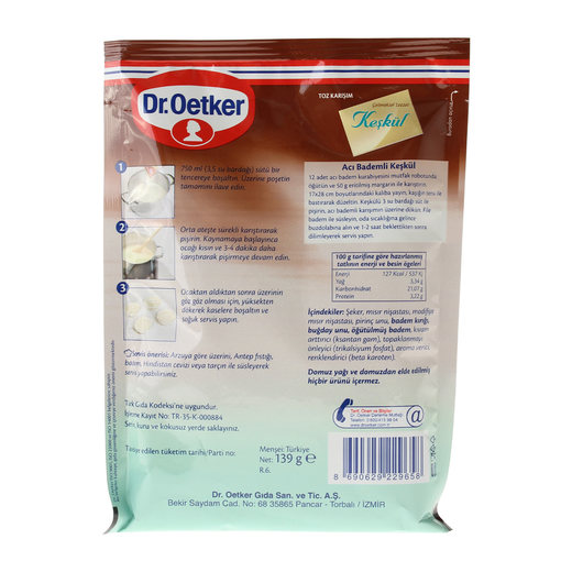 Geleneksel hikayeleri olan başka bir tatlı daha. 750 ml süt ile pişirilerek hazırlanıyor. Öğütülmüş badem içeriyor. Acıbademli keşkül hazırlamak için ambalajın arka yüzüne bakmak gerekiyor.