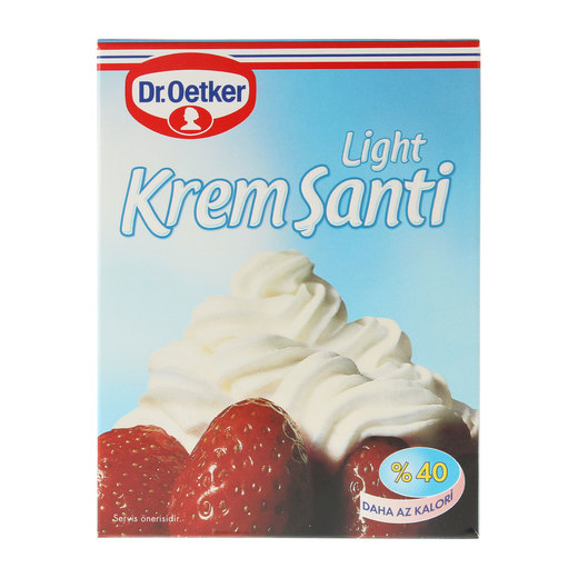 Tadını kaçırmadan hafiflemenin en güzel yollarından biri.Light Krem Şanti, krem şantiye göre % 40 daha az kalori içerir. Soğuk su ile çırpılarak hazırlanır. 38 g olarak poşette satışa sunulmuştur.Şeker yerine tatlandırıcı içerir.