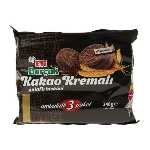 Eti burçak'ın geleneksel lezzeti, kakaonun cazibesi ile buluştu.Lifli bisküviler ilk kez kakao ile bir araya geliyor, iki kakaolu bisküvi arasındaki krema yeni Eti burçak kakao kremalı'nın lezzetini tamamlıyor.