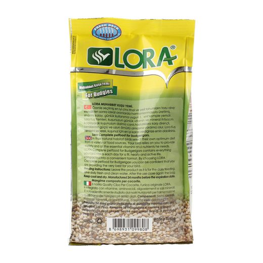 Lora kuş yemi,özenle seçilmiş en iyi cins ithal ve yerli tohumların tozu alınıp elendikten sonra ideal oranlarda harmanlanmasıyla üretilmiştir,sindirimi kolay,günlük kullanıma uygun 1.sınıf komple yemdir.Kuşunuzun günlük vitamin ve mineral ihtiyacını karşılayarak kuşunuzun daima canlı,hastalıklara karşı dirençli olmasına yardımcı olur.
