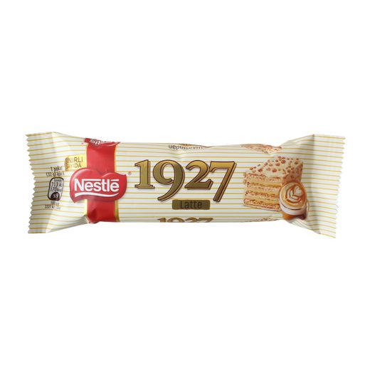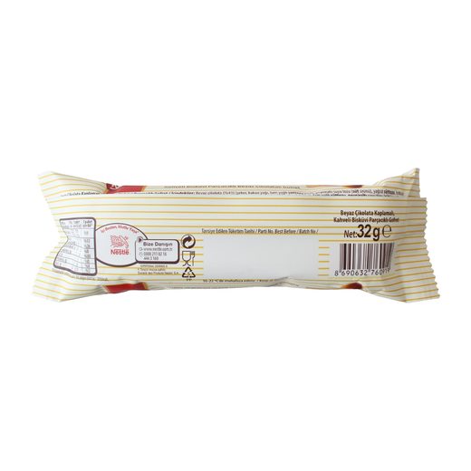 Beyaz çikolata kaplamalı kahveli bisküvi parçacıklı gofret.