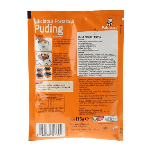 Portakallı çikolata tadını sevenler için özel olarak hazırlanmış olan puding karışımıdır. Pudinginizi hazırladıktan sonra özel kaselerinize ilave ederek pudra şekeri ile süsleyebilir ve daha lezzetli pudingler ortaya çıkartabilirsiniz.