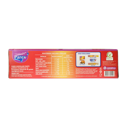 Parex buzdolabı poşeti meyve, sebze, kuru gıda gibi yiyeceklerinizi dış etkenlerden korur, gıdaların bozulmasını ve kurumasını önleyerek ilk günkü tazeliğinde korur. Dondurulacak gıdaların derin dondurucuda saklanması için idealdir. Her türlü gıda maddesini ağzını kapatarak buzdolabında saklayabilirsiniz.