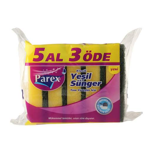 Parex yeşil sünger,dayanıklı dokusu ile zor kirleri ve lekeli yüzeyleri çabucak ovar ve temizler.Tüm sert yüzeylerde mükemmel sonuç sağlar.Özel formu sayesinde kullanırken tırnakları korur ve kavranması kolaydır.Başlıca kullanım alanları çelik tencere, tava, ızgara ve ocak üstü, farklı sert yüzeyler.