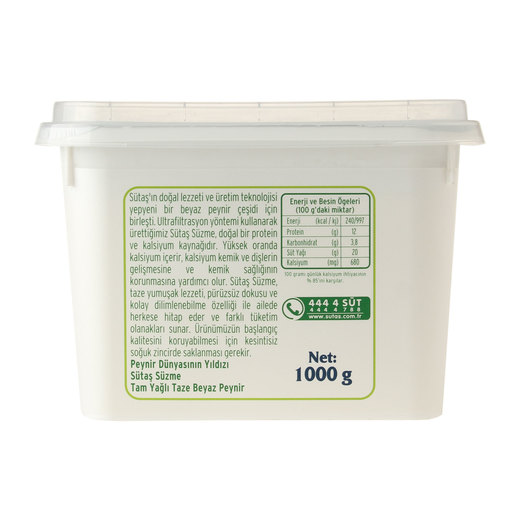 Sütaş süzme yumuşak lezzeti ve ağızda eriyen kıvamı ile her öğünde iştahla tüketilir.Sütaş ustalığı ve uzmanlığı ile üretilen Sütaş süzme,pürüzsüz dokusu ve yüksek besin değeri ile sofraların vazgeçilmezidir.Her damak tadına uyar,tüm aile bu peynirin keyfini birlikte yaşar.