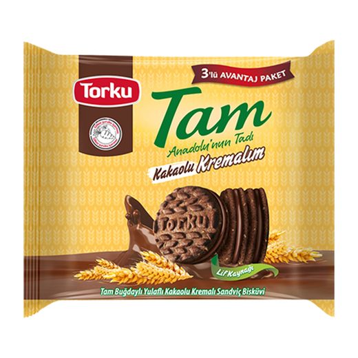 Torku tam kremalım kakao kremalı bisküvi, tam tahıllı, enfes kakao kremalı harika bir lezzet. Üstelik glikoz şurubu içermiyor.