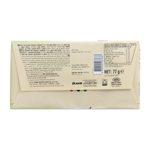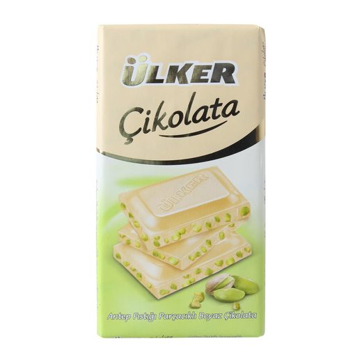Ülker Çikolata Fıstık Parçalı Beyaz, beyaz çikolata sevenler için denemeleri gereken yepyeni bir lezzet. Yoğun, beyaz çikolata lezzetine fıstık parçaları ekleyerek, kıtır bir kıvama getiren Ülker fıstık parçalı beyaz çikolata tatlı krizi anlarında imdadınıza yetişecek.