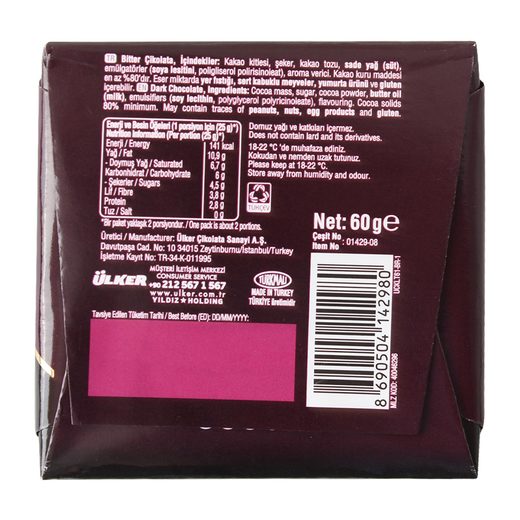 % 80 kakaolu, yoğun bitter aromalı leziz çikolata, tatlılarınız ve soslarınızda kullanarak da tüketebilirsiniz. Koku ve nemden uzak yerde muhafaza ediniz.